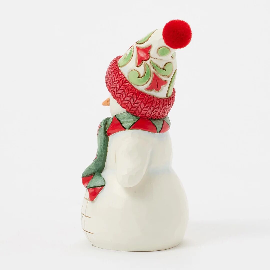 This charming Jim Shore pint snowman brings holiday joy with a playful scene of a curious puppy tugging at his scarf. Wearing a vibrant floral knit cap, the snowman smiles warmly, capturing the spirit of fun and friendship in wintertime.